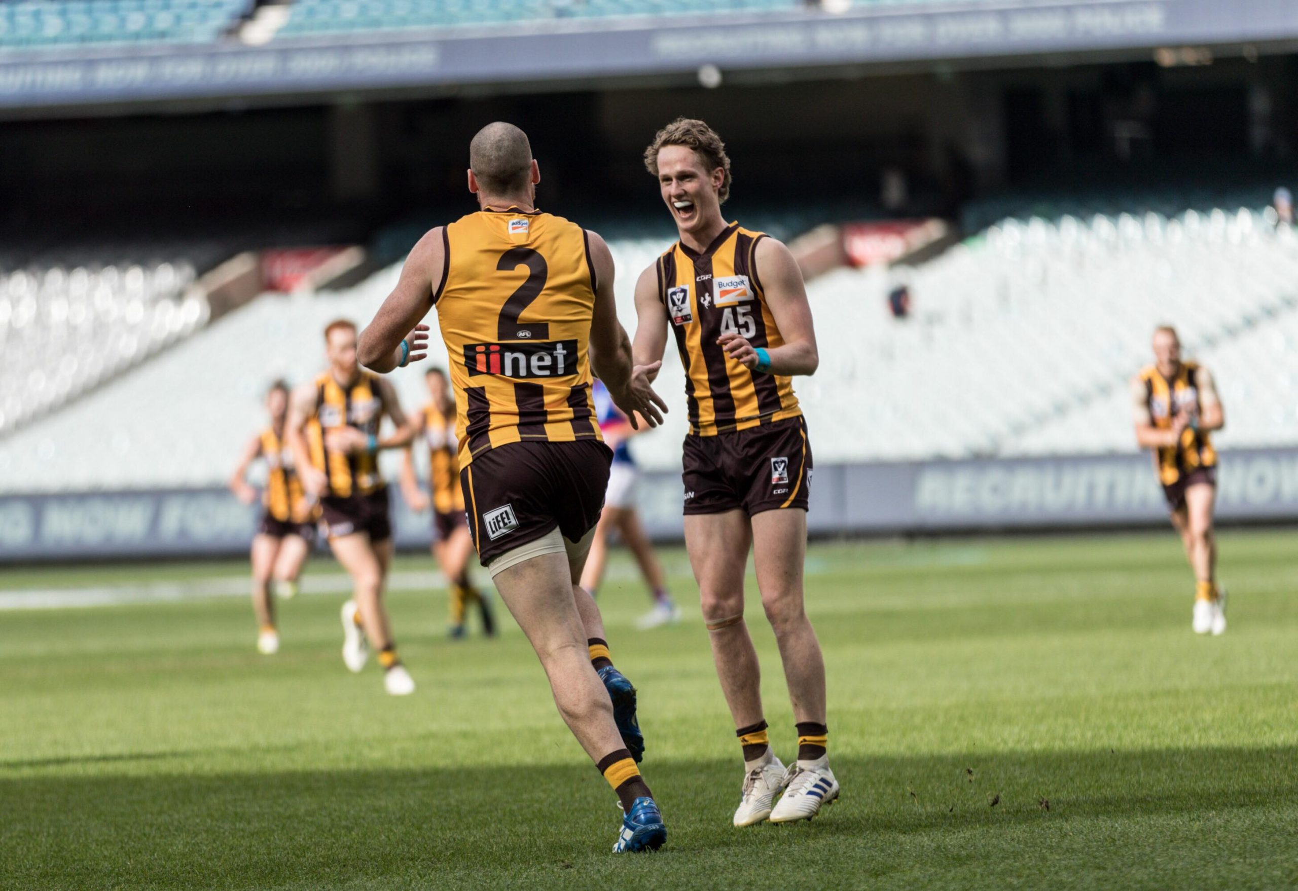 But the line ‘Cometh the hour, cometh the man’ had never been so relevant than when Box Hill Skipper Andrew Moore took a rousing pack mark in attack, 15 minutes into the term. Moore made no mistake in drilling the set shot, a true Captain’s goal, and with tape hanging off him his celebration was like a scene from ‘Gladiator’ – as the Hawks took a six-point lead.